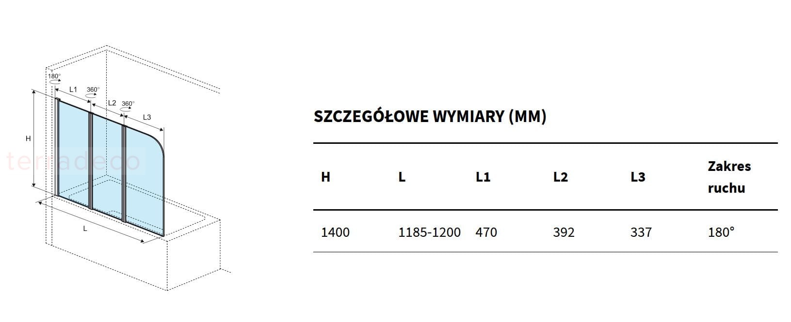 - Parawan wyposażony jest w unoszony zawias o zakresie ruchu 180 stopni, który sprawia , że składanie i rozkładanie parawanu jest jeszcze bardziej wygodne. Pozwala to na przykład na wygodne czyszczenie rantu wanny i trudno dostępnych elementów parawanu.