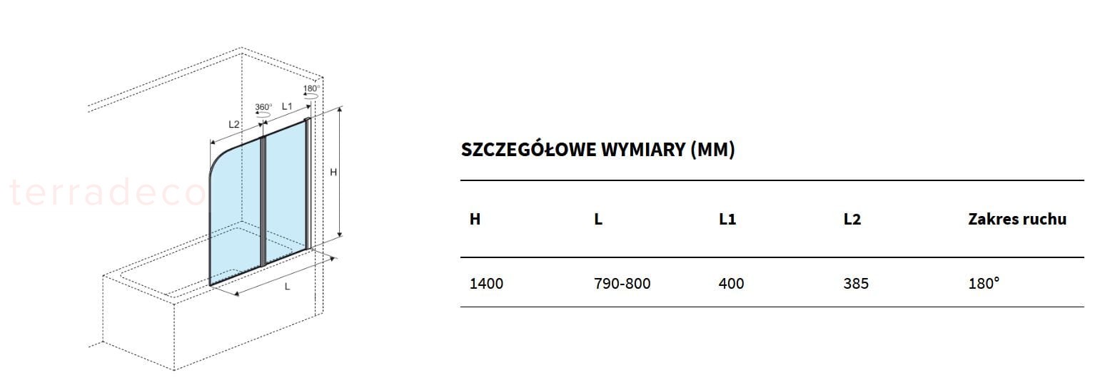 - Parawan wyposażony jest w unoszony zawias o zakresie ruchu 180 stopni, który sprawia , że składanie i rozkładanie parawanu jest jeszcze bardziej wygodne. Pozwala to na przykład na wygodne czyszczenie rantu wanny i trudno dostępnych elementów parawanu.