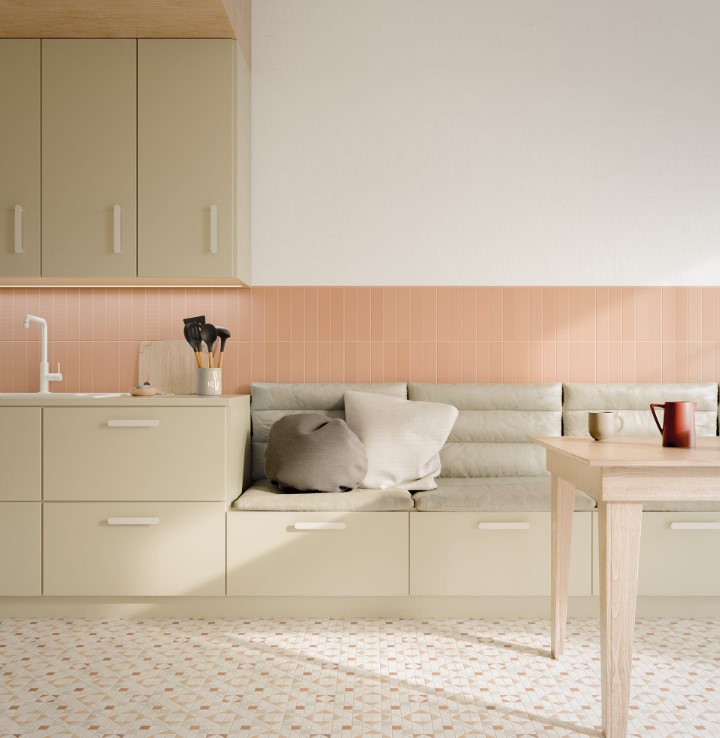 Kolejną opcją są pastele. Krem tworzy ciekawe połączenia z kaflami monochromatycznymi w odcieniu pudrowego różu, mięty, przytłumionego błękitu. W zestawieniu z miedzianą armaturą kuchenną daje modne wnętrze kawaii lub w stonowanej odsłonie vintage.