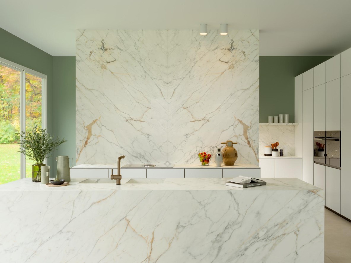 Ciemne fronty nadają wnętrzu ekskluzywności. Świetnie komponują się z imitacją marmuru w kontrastowej, białej odsłonie. Idealnie wyglądają na tle np. kafli ściennych i podłogowych ze złotym żyłkowaniem ITT Sahara Bianco Polisch Rect. 120x120.