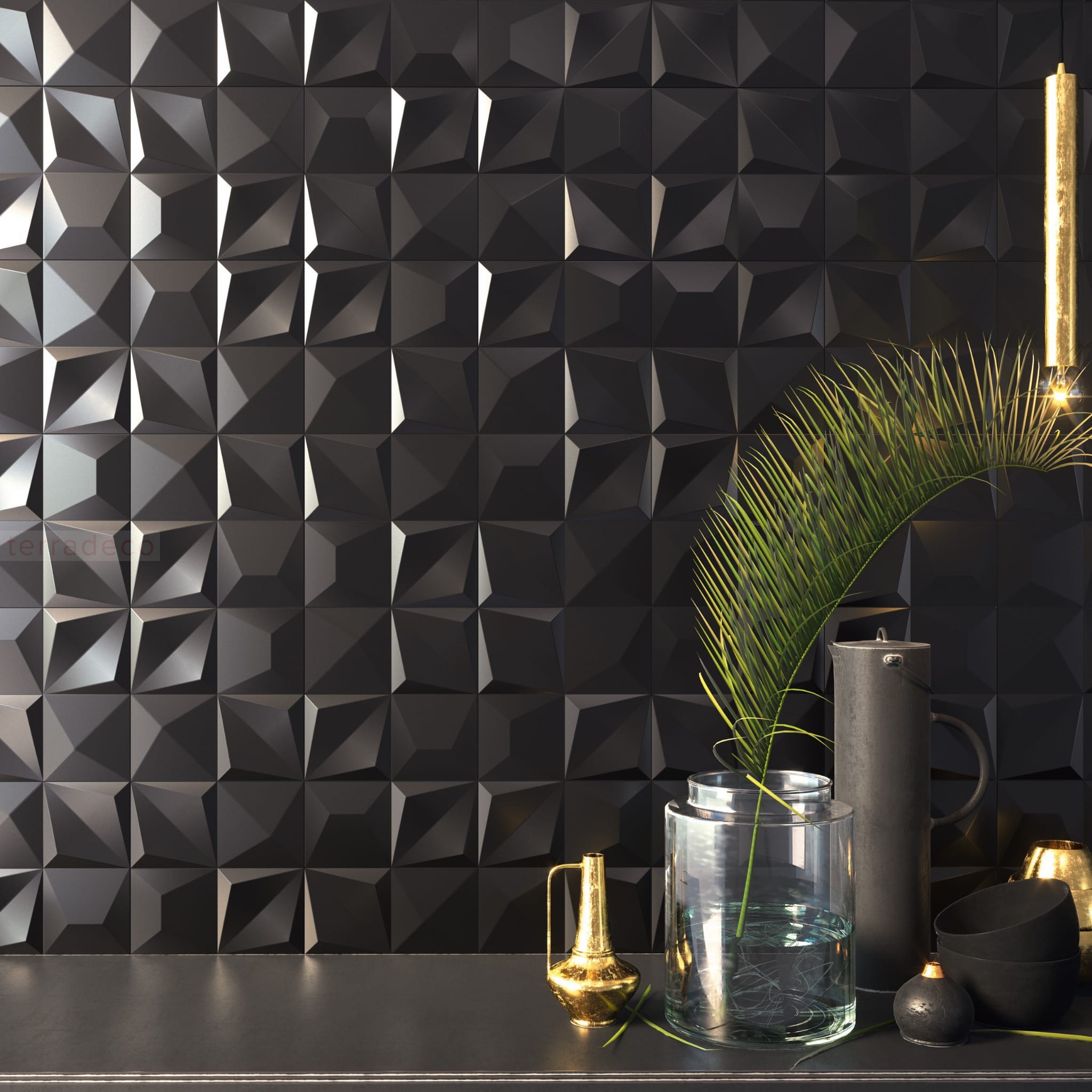 Trójwymiarowe płytki ścienne o głębokim, nasyconym odcieniu czerni – to produkt hiszpańskiej marki Dune, zajmującej się ceramiką łazienkową i nie tylko. Wyrazista gra wgłębień i wypukłości poszczególnych elementów kafelków sprawia, że pomimo ciemnej barwy od razu przyciągają one wzrok. Matowa powierzchnia dodatkowo podkreśla elegancki wygląd materiału wykończeniowego. Czarne kafelki w formacie 25x25 cm doskonale prezentują się w towarzystwie wszystkich metalicznych dodatków: srebrnych, złotych, chromowanych czy miedzianych. Hiszpańskie kafelki są wspaniałym sposobem na uatrakcyjnienie wybranego fragmentu ściany.
