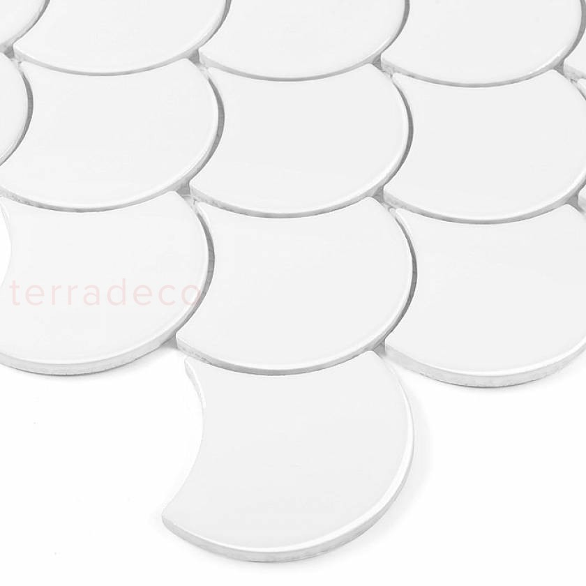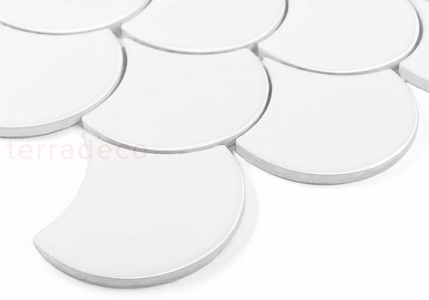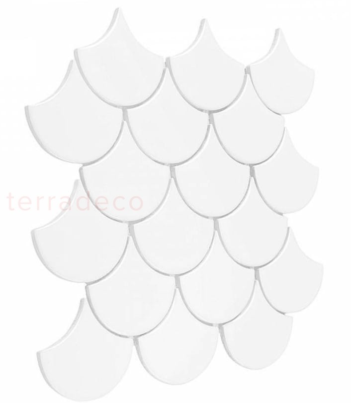 Powierzchnia płytki Dunin jest dekoracyjna mimo swojej monochromatyczności i minimalistycznym elementom. Jej ozdobny charakter nabierze silniejszego wyrazu, jeśli . przestrzenie między osiemnastoma elementami, z których składa się jedna Fish Scale White Mini, wypełnione zostaną czarną lub szarą fugą. To pozwoli stworzyć kwintesencję kolorystycznej elegancji w zupełnie nowoczesnym wydaniu. W ten sposób ceramika będzie idealna do łazienki i kuchni w stylu glamour lub art deco, a złote dodatki wprowadzą element luksusu.