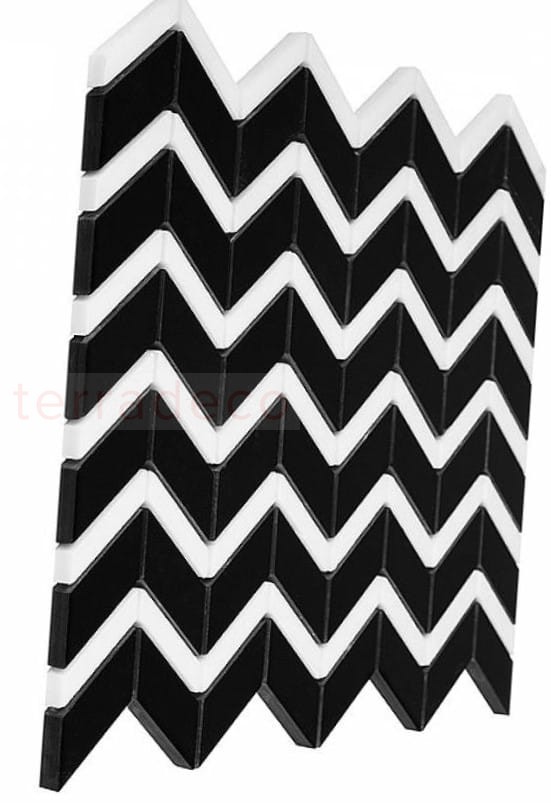 Po raz kolejny polski producent łączy klasykę z nowoczesnością. W Pure Black Chevron Mix doskonale zestawił ze sobą klasyczną, czarno-białą mozaikę dekoracyjną z innowacyjnym wzorem “w jodełkę”, który święci triumfy w aranżacji wnętrz. Czarne elementy są motywem dominującym, a białe, wąskie prostokąty jedynie przełamują głębię ciemnej barwy. Ten klasyczny kontrast nie traci nic ze swojej elegancji nawet w zestawieniu z nowatorską strukturą.
