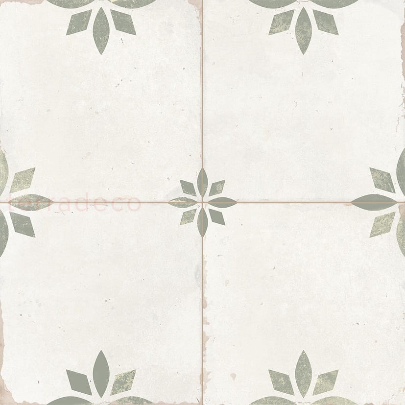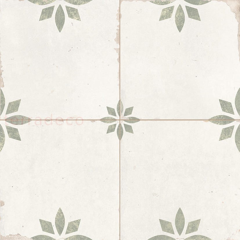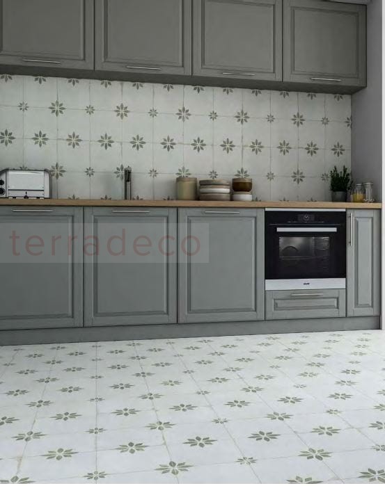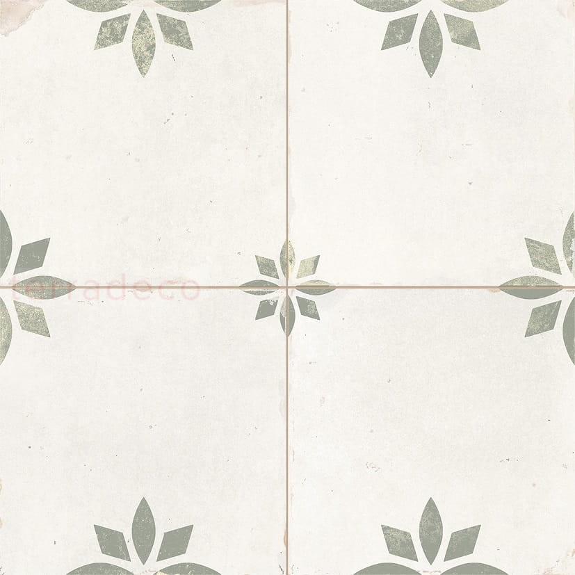 Subtelności kaflom dodają stonowane kolory. Kremowe tło uwidacznia drobne, szarozielone diamenty i elipsy, które zestawione ze sobą tworzą wzór drobnych kwiatów ułożonych w równych odstępach. To nadaje wyrazistości. Potęguje ją postarzana powierzchnia z lekkimi przetarciami i odpryskami. To ona determinuje przeznaczenie Peronda Savannah Sage. Kafle pasują do wnętrz rustykalnych, boho, eklektycznych i vintage. Ich ornamentyka jest atrybutem w szczególności w kuchni: nad blatem roboczym i na podłodze. Zabrudzenia są mniej widoczne, a matowe płytki rustykalne czyści się bez problemu.