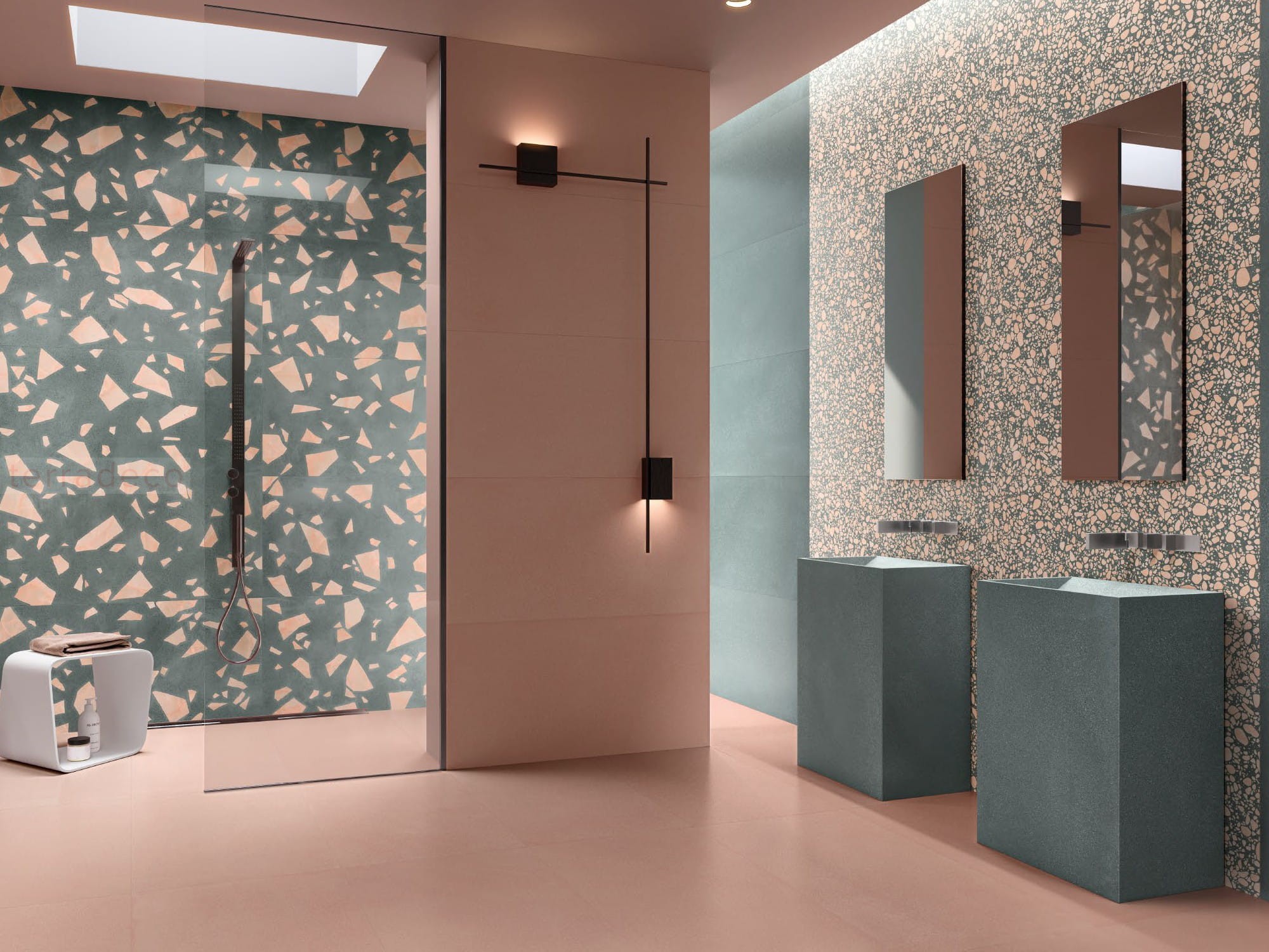 Płytki firmy Emil Ceramica to urok i elegancja w jednym. Lastryko w bladym, zielonym kolorze stworzone przez włoskiego producenta zachwyca swoim niebanalnym wyglądem. Zieleń w połączeniu z dyskretnymi, błyszczącymi drobinkami tworzy subtelny efekt, który uwydatnia wnętrza. Matowa powierzchnia płytek sprawia, że doskonale komponują się z ze style minimalistycznym i nowoczesnym. Terrazzo świetnie współgra z meblami o prostych formach oraz dodatkami w stonowanych barwach. Zaś chłodna, spokojna kolorystyka wprowadza do przestrzeni równowagę. Ten odcień harmonizuje również z estetyką stylu vintage i boho. Kafle lastryko mogą pełnić rolę dekoracji, uzupełniając przestrzeń między szafkami kuchennymi czy we wnęce łazienkowej.
