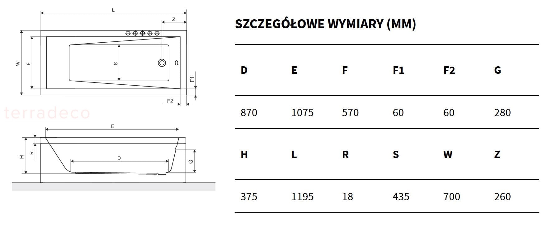 - Rozmiar D/S/W mm: 1195/700/375