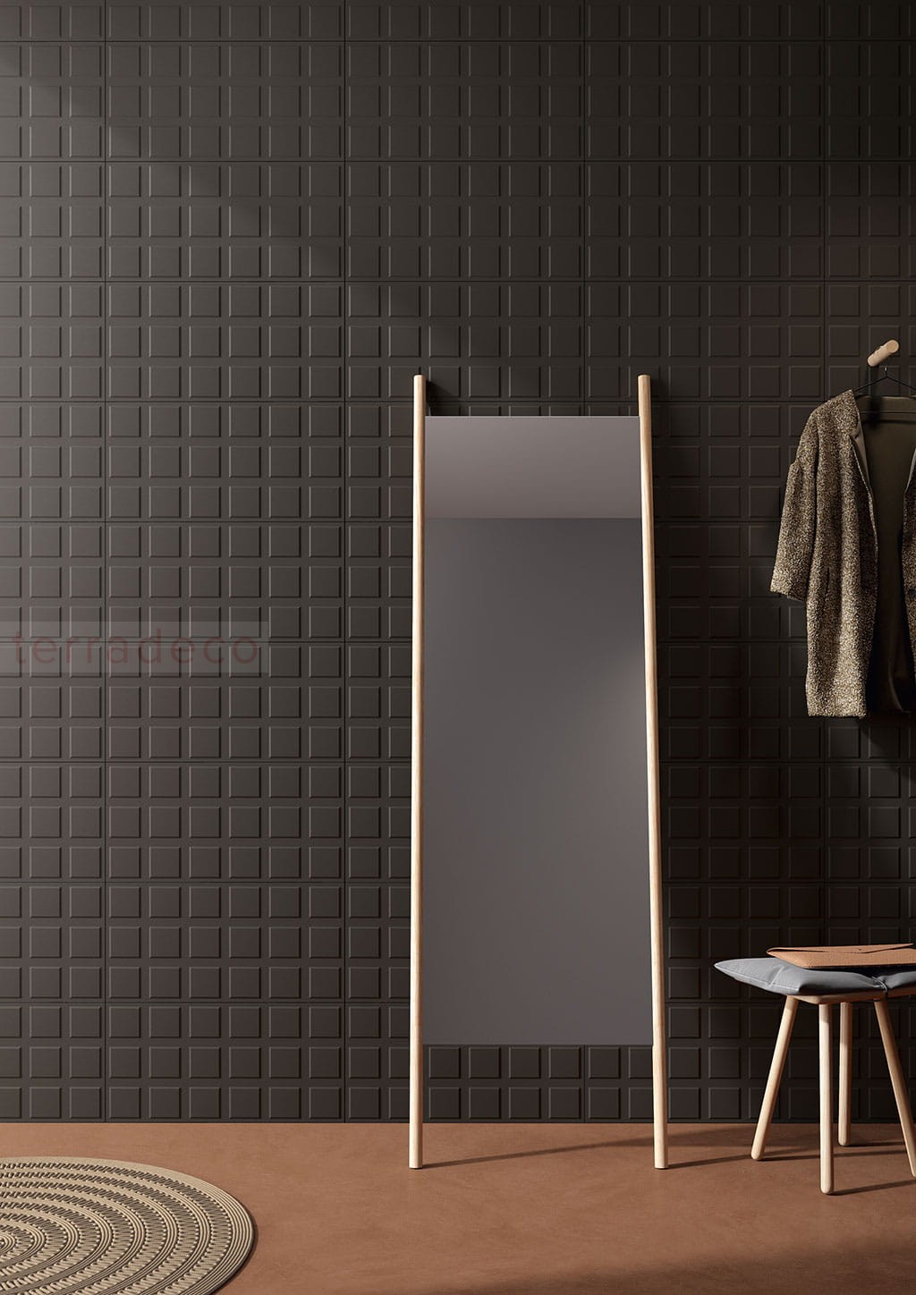 Płytka ścienna doskonale komponuje się z jasnym drewnem – w postaci mebli, dodatków czy podłogi. Grafit dodaje pomieszczeniu wyrazistości, a jasny beż go ociepla. Równie dobrze ozdobna struktura wygląda w ultra nowoczesnym mieszkaniu – w towarzystwie szkła, betonu i metalu. Hipnotyzujące układy płytek wzbogacą minimalistyczną przestrzeń i wystąpią w roli intrygującego akcentu.