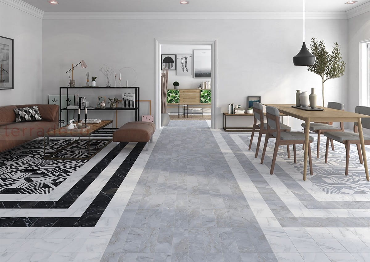 Wzorzysta czarno–biała posadzka – ile procent pomieszczenia powinna zajmować?