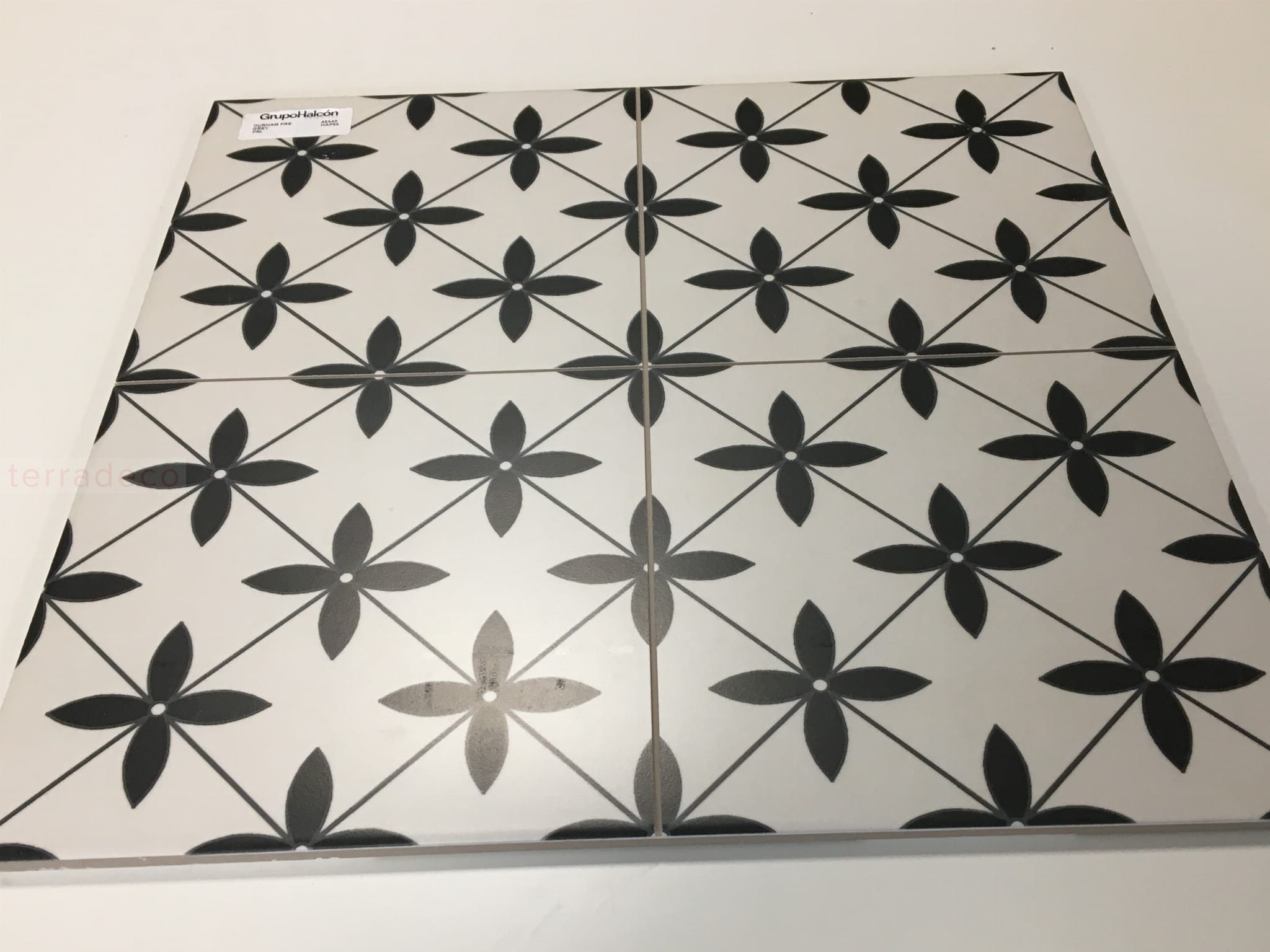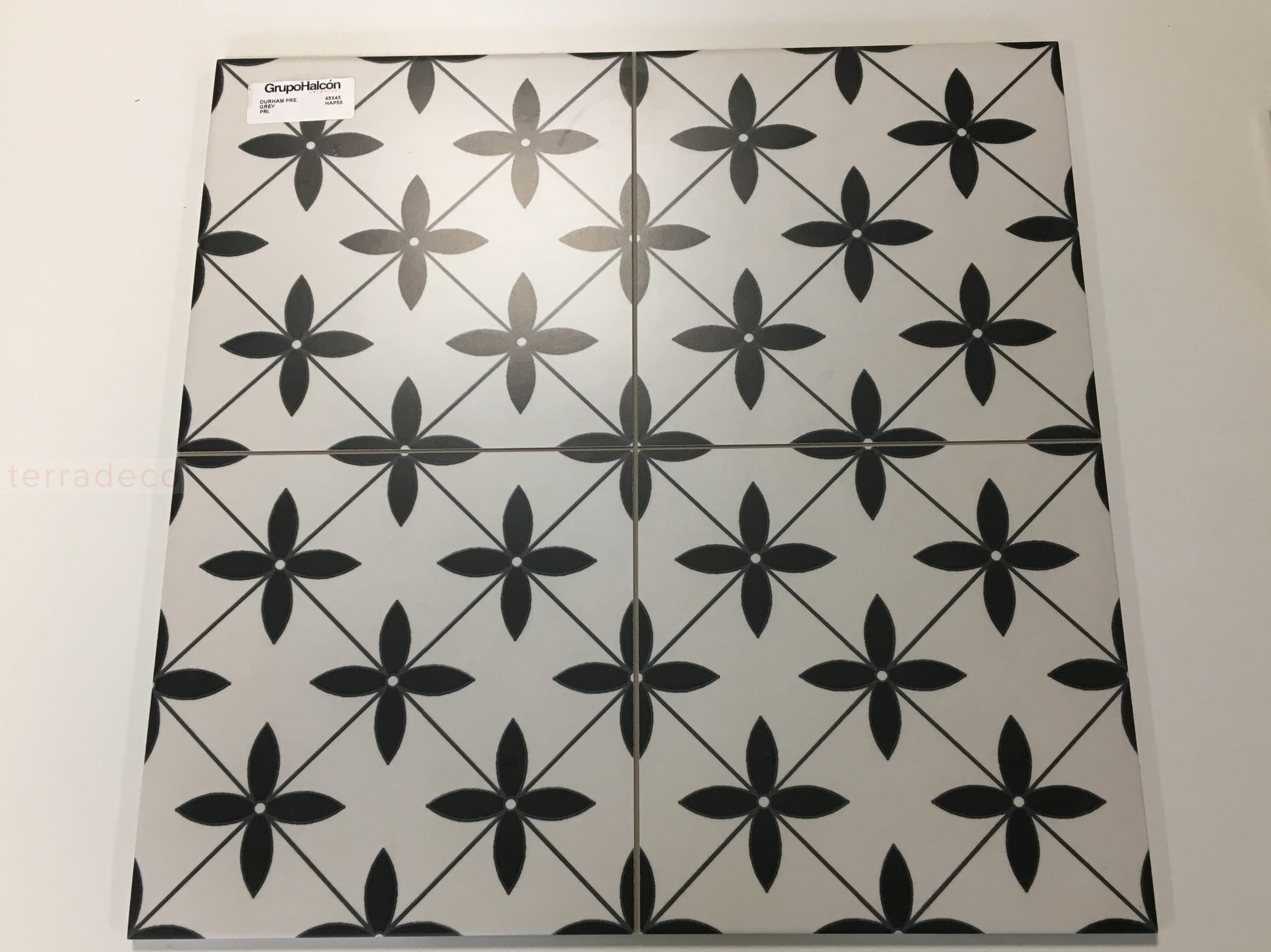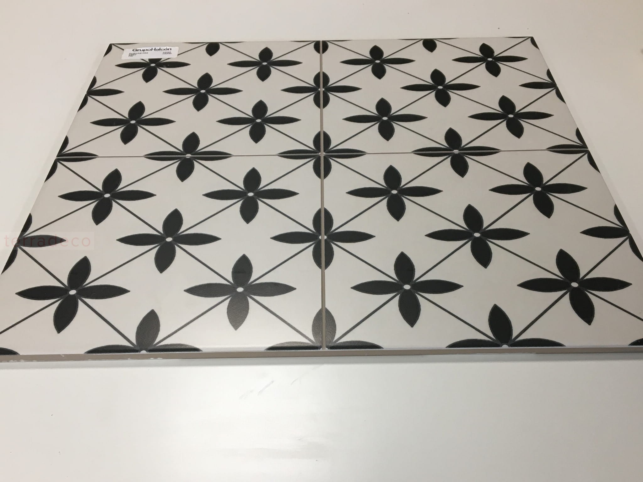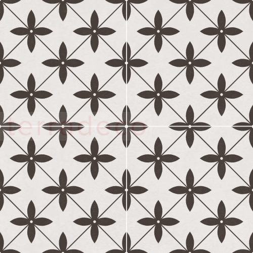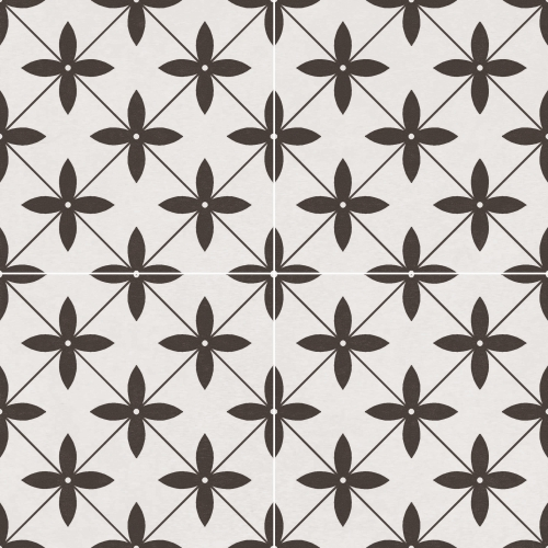 Płytka gresowa o wymiarach 45x45 cm została wyprodukowana przez znaną hiszpańską markę Halcon. Estetyczna siła kwadratowych kafelków w kolorach czerni i bieli tkwi w wysmakowanej prostocie. Na wierzchołku każdego rombu umieszczono kwiat o czterech geometrycznych płatkach. Elementy wyróżnia klarowność linii i uporządkowanie. Co ważne, płytki gresowe o wyrazistym rysunku prezentują się wyśmienicie solo, w grupach, jak i zajmując całą powierzchnię podłogi czy ściany. Matowa powierzchnia kafelków dodaje im elegancji, a mrozoodporność – uniwersalności.