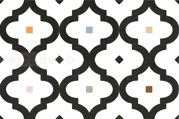 Płytkę gresową, która świetnie sprawdzi się jako dekor we wnętrzach, stworzono, inspirując się wzorniczym dziedzictwem Orientu. Na kwadratowych kafelkach znalazł się czarno–biały wzór marokańskiej koniczyny. O innowacyjnym podejściu do tematu świadczy umieszczenie kwadratowej kropki w każdym z kształtów: czarnych, żółtych, pomarańczowych, zielonych, niebieskich czy różowych. Tym samym wyrazistość płytek na podłogi i ściany zostaje przełamana nutą radości oraz zabawy. Kafelki cechują się też matową powierzchnią i mrozoodpornością. Produkt hiszpańskiej marki Vives.