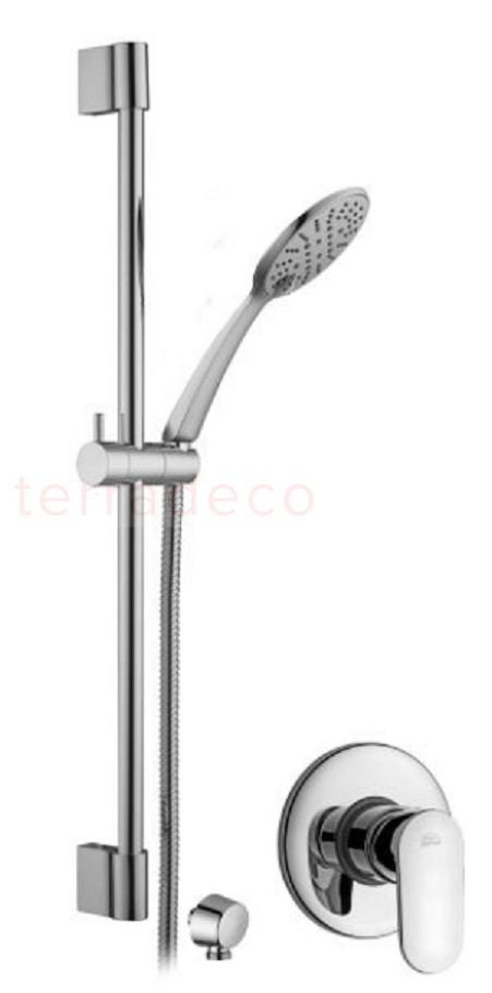 Tym razem Paffoni samodzielnie proponuje idealne połączenie elementów, które tworzy komfortową, funkcjonalną i estetyczną przestrzeń natryskową. W skład zestawu wchodzi minimalistyczna bateria podtynkowa, okrągła, klasyczna słuchawka prysznicowa oraz funkcjonalny uchwyt i drążek. Wszystkie elementy współgrają ze sobą. Łączą je owalne linie, które nadają propozycji nieco delikatności. Okrągła słuchawka tworzy synchroniczną całość z panelem baterii prysznicowej w kształcie rozety. Sam uchwyt do ciepłej i zimnej wody jest krótki i niemal stapia się z tłem. Drobnym, subtelnym akcentem dekoracyjnym jest logo producenta umieszczone w jego centralnej części.