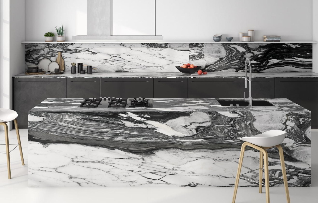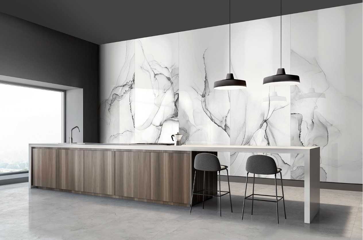 W dużych, modnych przestrzeniach płytki gresowe wielkoformatowe mogą być stosowane jako obudowa wyspy kuchennej, a nawet jako blat ułożony bezpośrednio na szafkach.