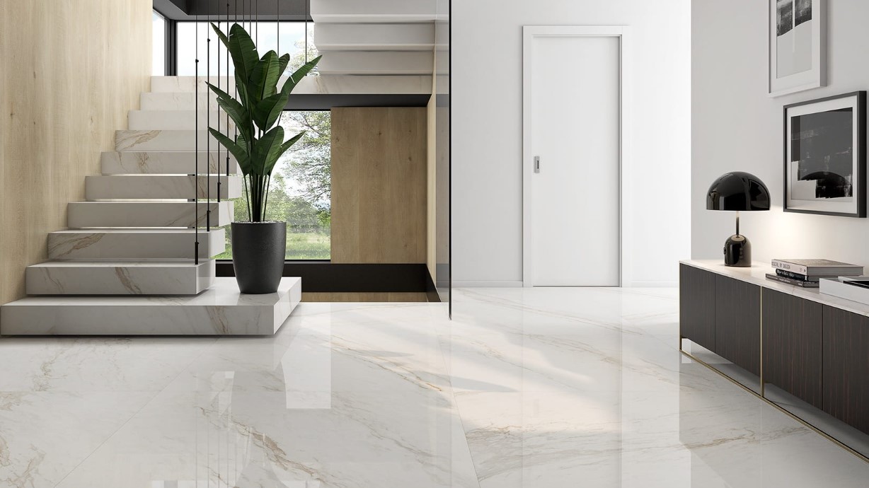 Wielkoformatowe płytki podłogowe są trwałe i wytrzymałe. Długo zachowują swój estetyczny wygląd, nawet przy intensywnym użytkowaniu. Dlatego sprawdzają się w holu i w częściach komunikacyjnych.