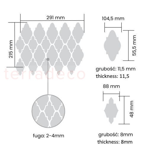 - Wymiar pojedynczego kafelka: 104,4 x 55,5mm + 88 x 48mm