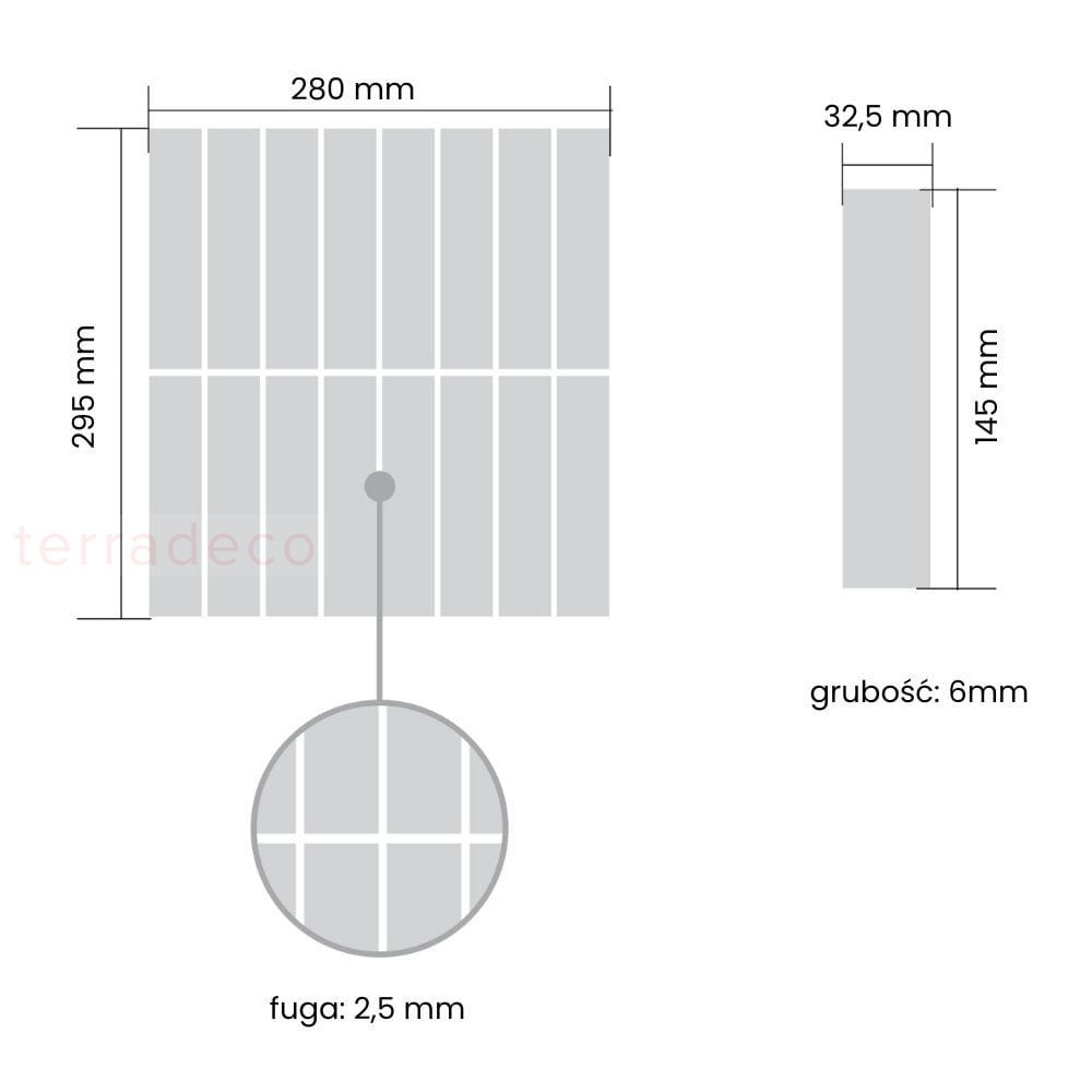 - Wymiar pojedynczego kafelka: 145 x 32,5mm