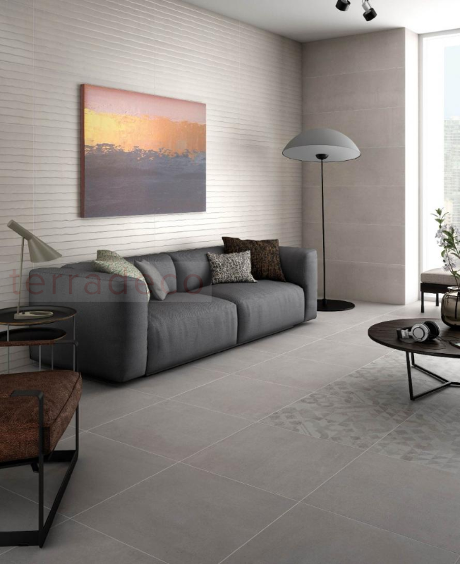 Nowoczesna przestrzeń z płytką gresową Saloni Sunset Gris 60x60