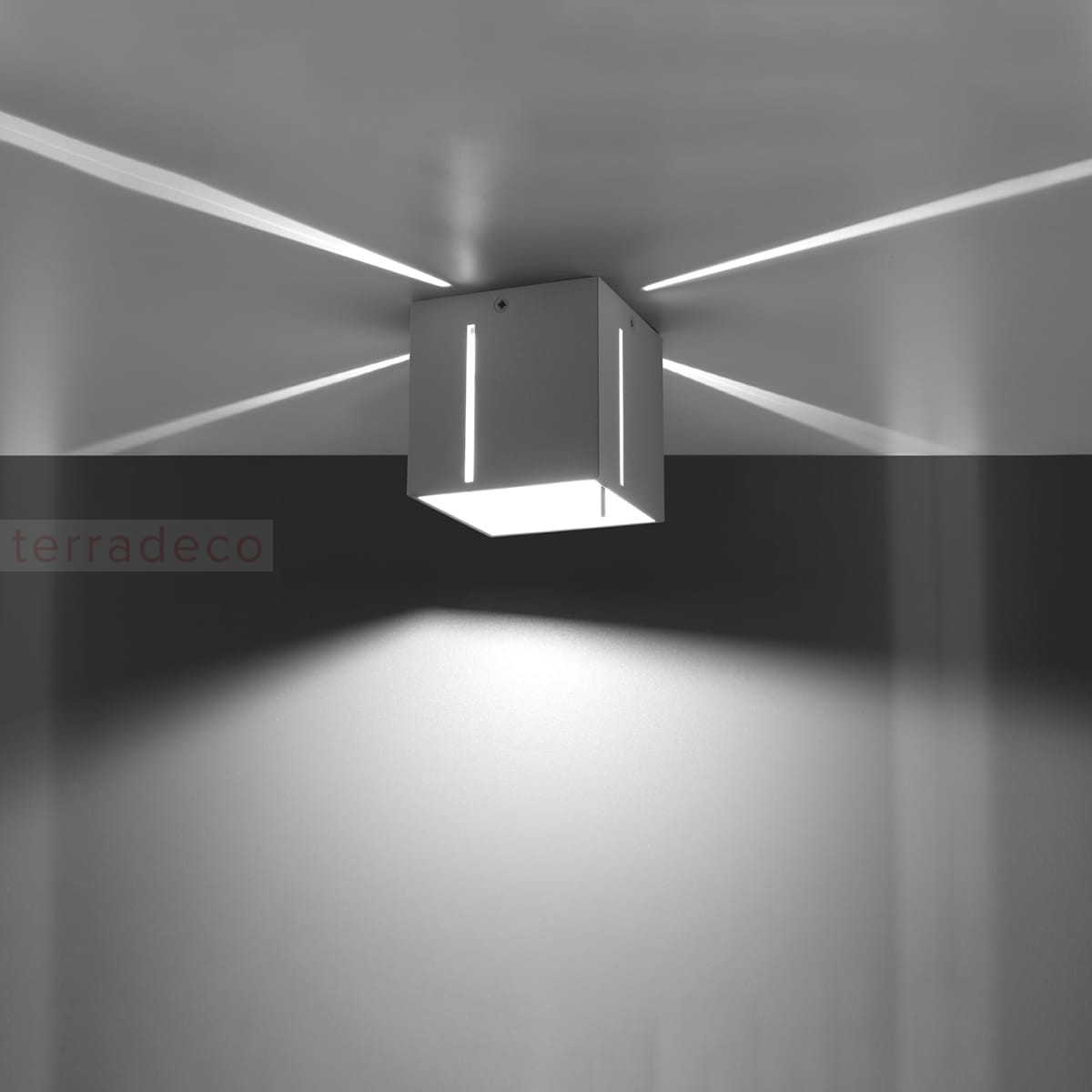 Plafon PIXAR świeci w dół, ale blask sączy się także przez liniową perforację w bocznych ścianach klosza. Gdy go zaświecisz, zamienisz cały sufit w efektowną dekorację.