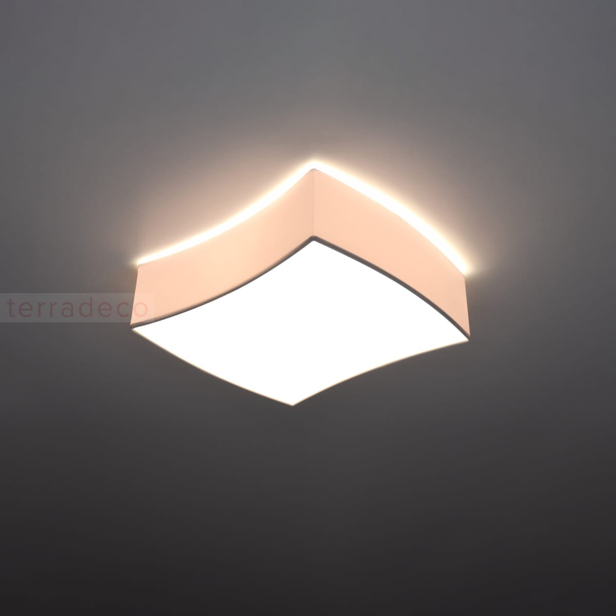 Łagodny kształt boków lampy układa się w delikatną falę, która kontrastuje z wyraziście zakończonymi rogami plafonu. Jednak mimo zestawienia tak pozornie odmiennych form, SQUARE zachwyca idealną spójnością wizualną, ciesząc oczy gości oraz domowników także za dnia.