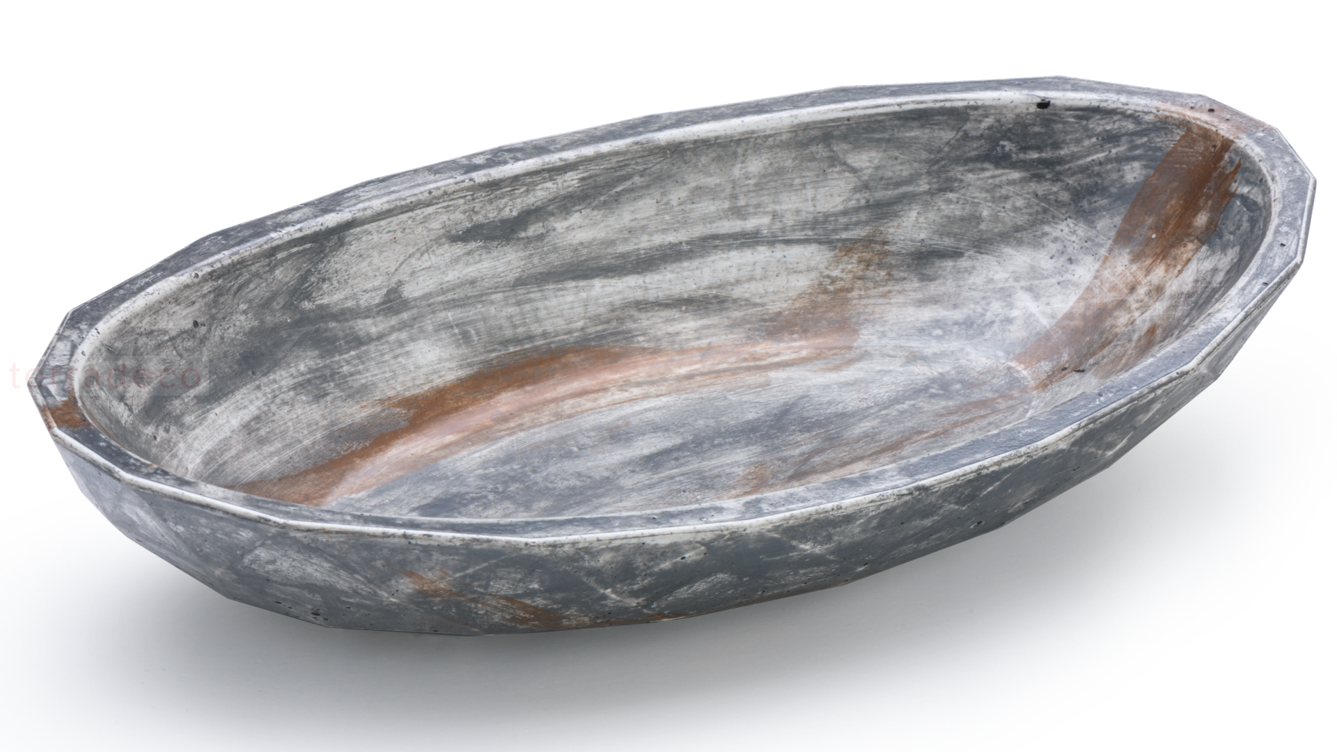 - Zewnętrzna strona miski owalnej DIAMOND przypomina oszlifowany kamień szlachetny. Ręcznie wykonany dekor PAST to imitacja gołych ścian odartych z tapet i starych nalotów farb.