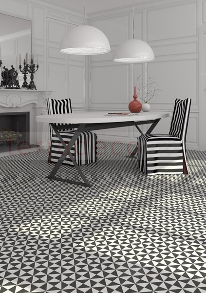 Płytki hiszpańskiej marki Vives z kolekcji 1900 mają status kultowych. Wyjątkowy wygląd zawdzięczają oryginalnemu designowi, który towarzyszy ponadprzeciętnej jakości. Czarno–białe kafelki zmienią nudne pomieszczenie w wysmakowane wnętrze. Matowe płytki w formacie 20x20 cm deklasują rywali dzięki wysokiej, III klasie ścieralności. Płytki na podłogi i ściany cechują się mocnym oraz geometrycznym wzorem. Przeplatające się białe oraz czarne trójkąty świetnie wypełniają zarówno przestrzeń podłogi, jak i ścian. Dzięki swojej wyrazistości kafelki stają się głównym elementem, który wyróżnia dane pomieszczenie. Efektowne i praktyczne!