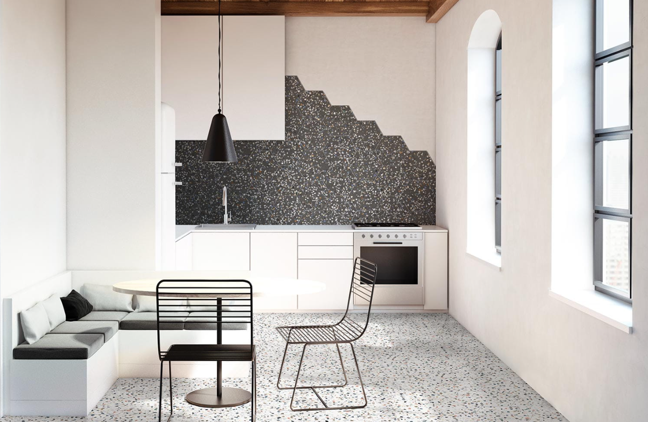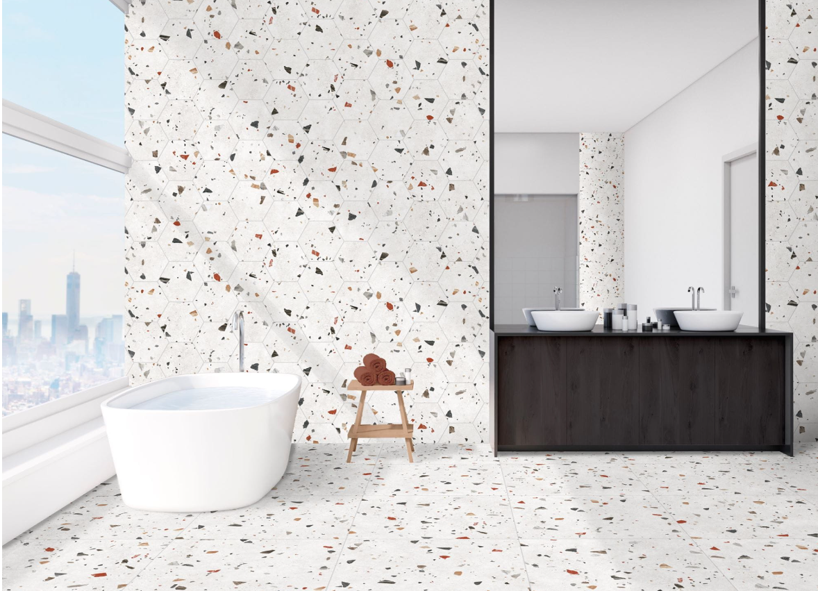 Ciekawą propozycją jest terrazzo w kształcie heksagonów. Płytki sześciokątne dodają dekoracyjności, a jednocześnie sprawiają, że kafle są lżejsze w odbiorze. Ich forma daje też większe możliwości tworzenia ciekawych połączeń i sposobów układania.