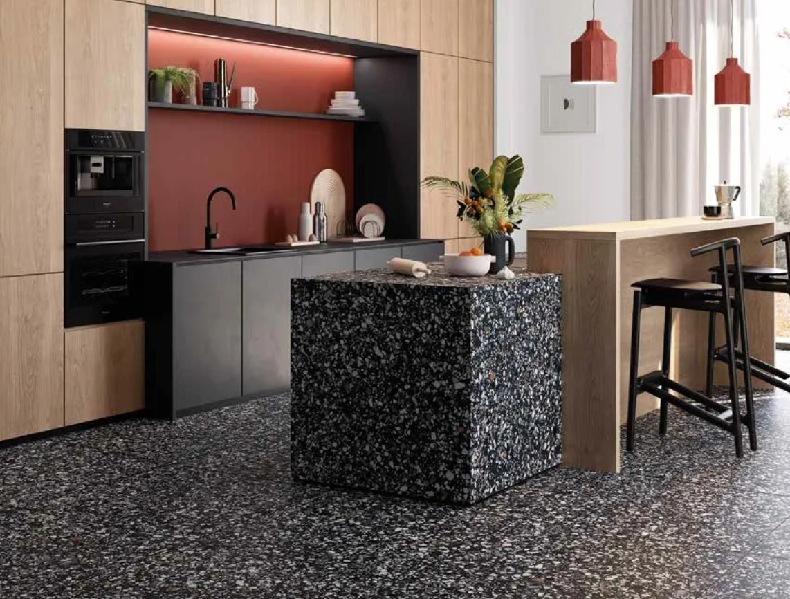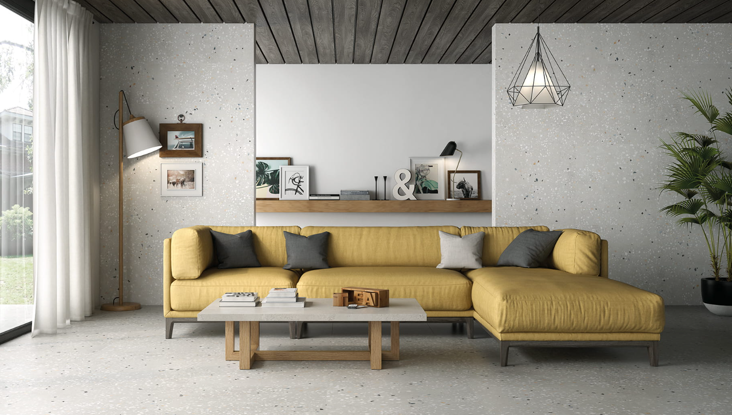 Wykorzystaniu płytek lastryko w domu sprzyja także ich wielkość. Obok uniwersalnych wymiarów 60x60 cm bez problemu znajdziesz również kafle wielkoformatowe 120x120 cm lub nawet 120x260 cm, np. Marazzi Grande Stone Look Ceppo di Gre Grey 120x278 cm M9CW. Dzięki nim ograniczasz ilość szczelin fugowych, które najłatwiej ulegają zabrudzeniom i uszkodzeniom. Przestrzeń zyskuje na estetyce i elegancji.